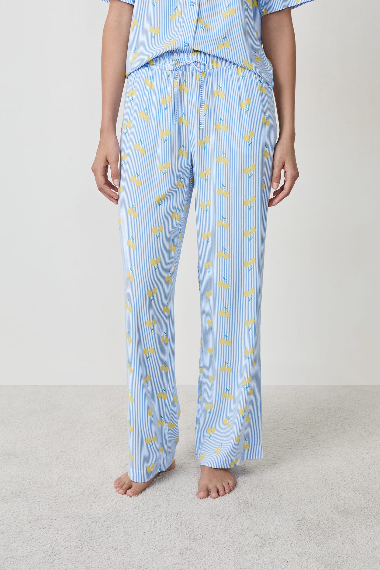 Les citrons s’invitent en all-over sur ce pantalon de pyjama. La silhouette se fait fluide grâce à sa coupe évasée, structurée par des cordons à nouer. Pratique, il se pare de deux poches à l’avant.