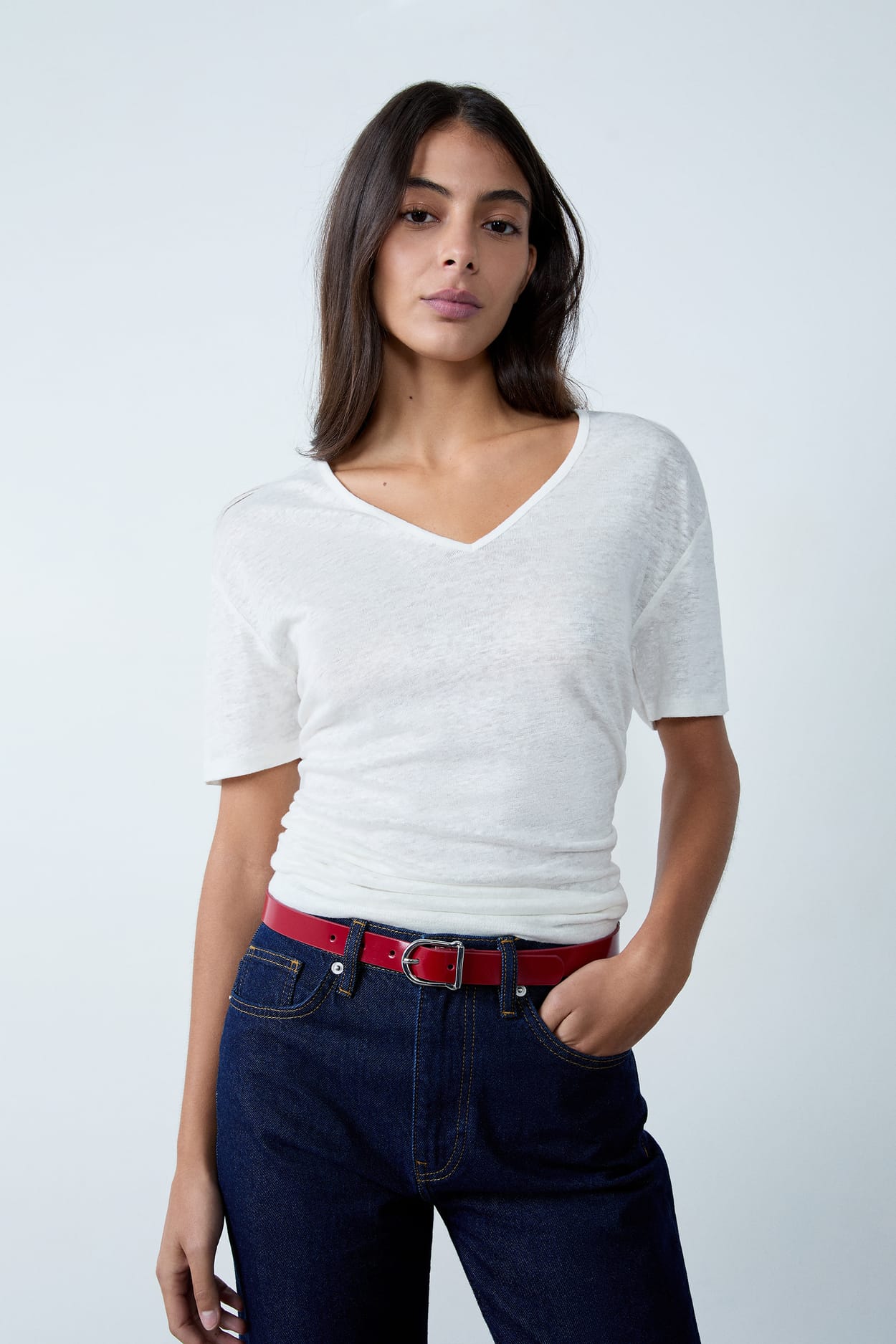 T-shirt col V 100% lin;${refinementColor}